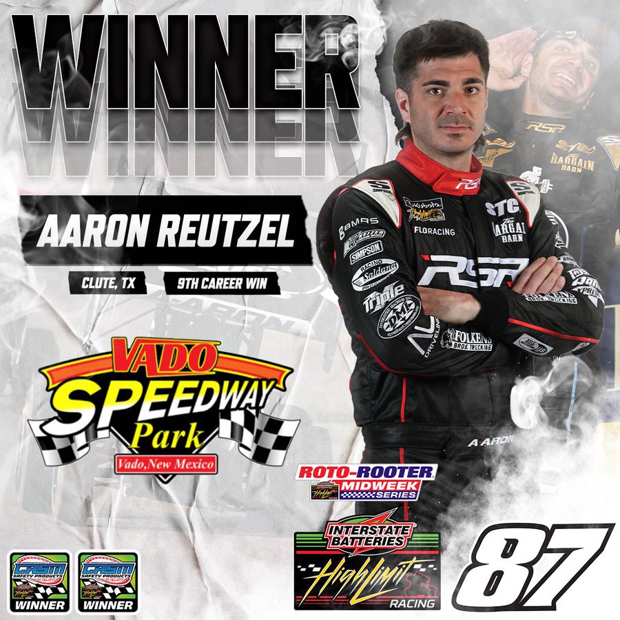 Aaron Reutzel took the Ridge Sons Racing No. 87 from Clute, Texas, and drove it straight to his ninth High Limit victory and his first repeat win of the 2026 season.
