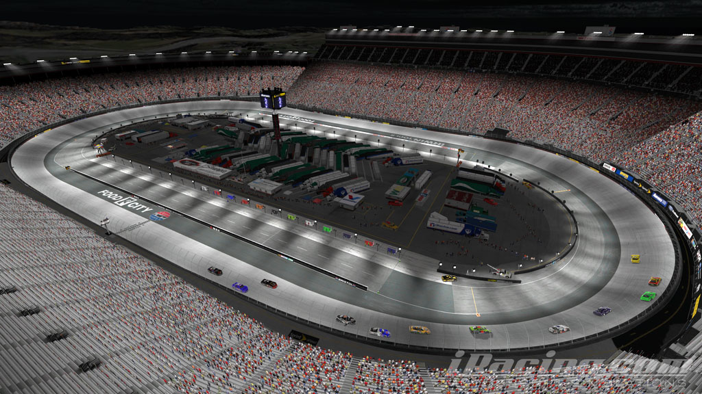 Bristol Motor Speedway is a .533 mile track located in Bristol, Tennessee. The track has a typical oval shape that is almost symmetrical. Turns one and two are just a little bit tighter but you really have to drive it a while to notice it. The turns feature progressive banking from 26 – 30° with 6-10° banking on the straights. The racing surface is good quality concrete and it’s about 3 lanes wide.