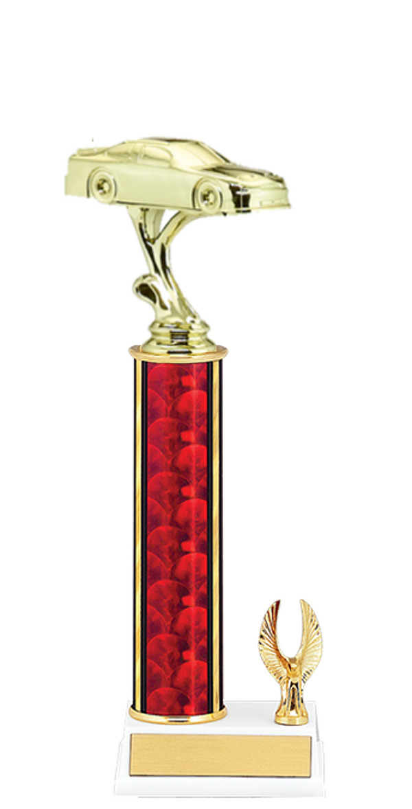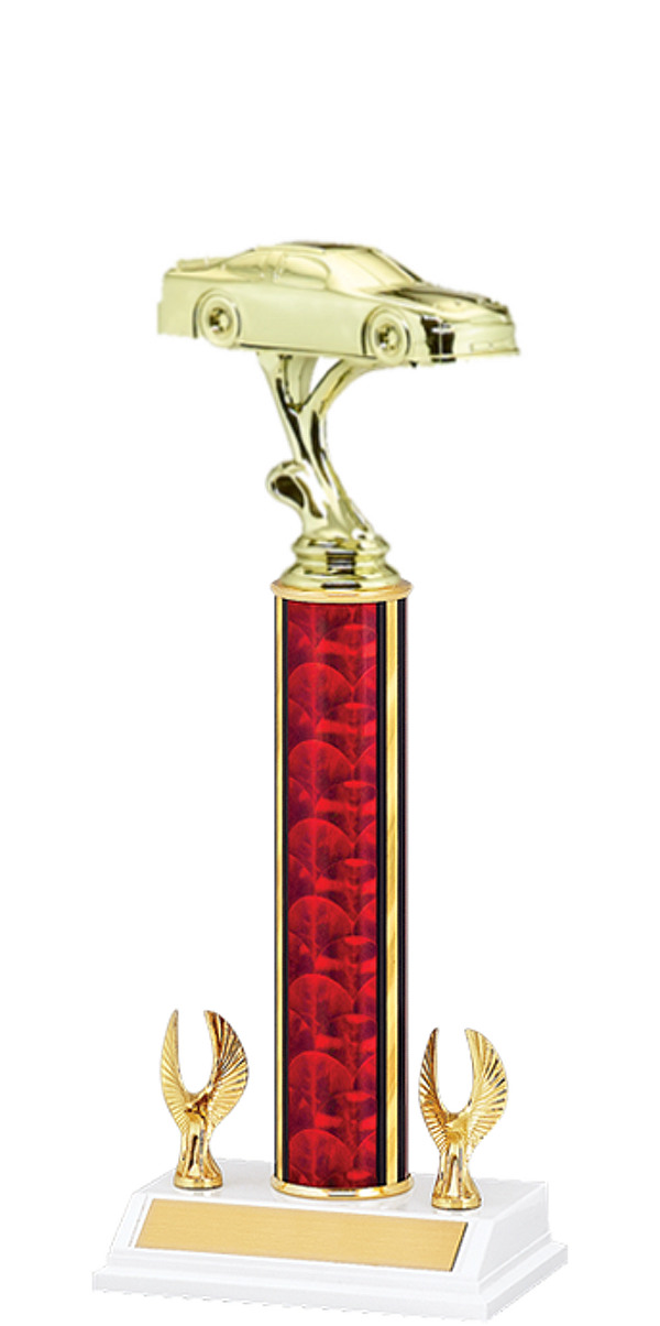 For the Super Late Model Champion, we have this fourteen inch trophy with the classic round red and gold column and two eagles mounted on the wide marble-tone base.