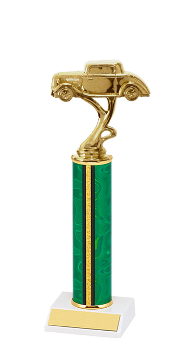 For the Legends Division, we have this ten inch classic round column trophy with a green and gold column and a white marble-tone base. Along with the classic jalopy style figure on top, I thought it would be perfect for the Legends Champion.
