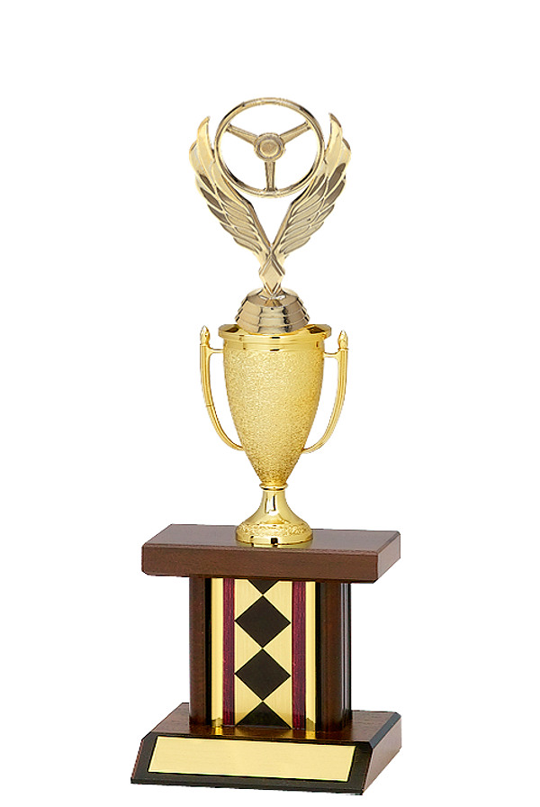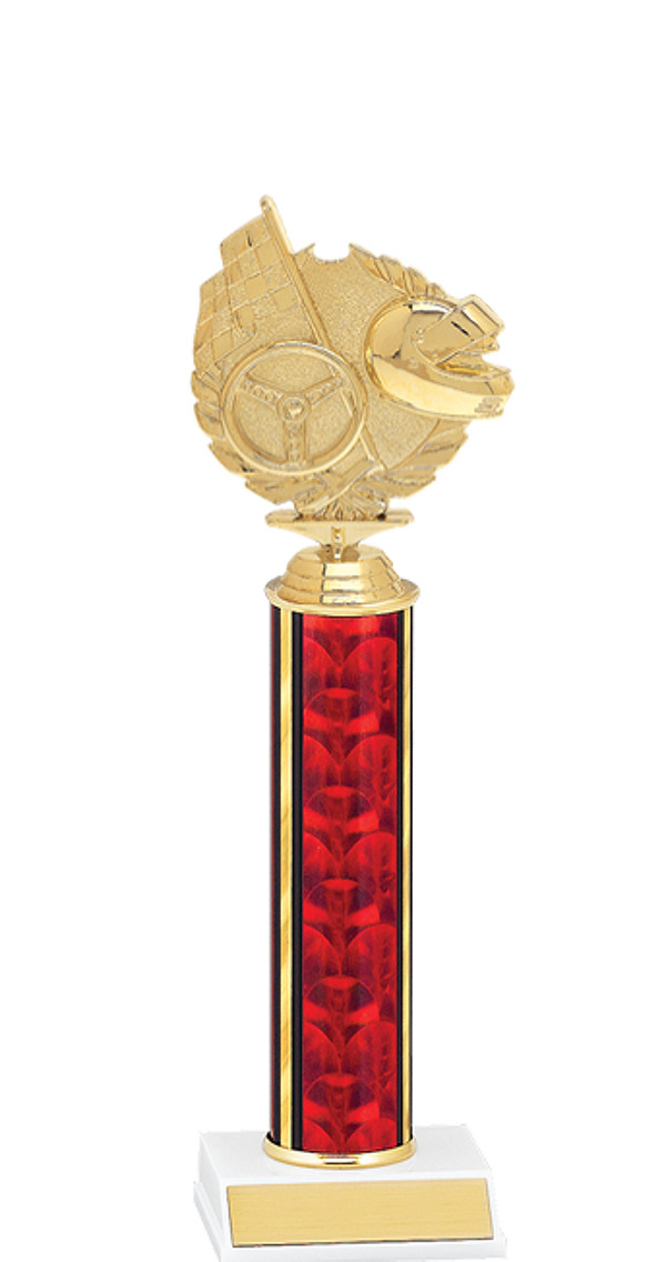 For the SK Modified we have a twelve inch trophy with a red and gold classic round column and the marble-tone base and a 3-D auto racing top figure.