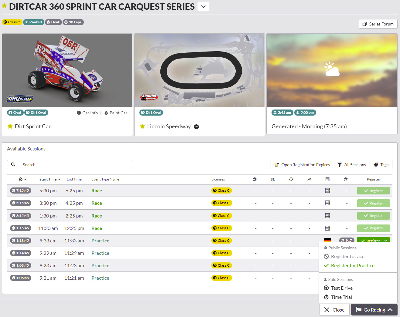 - With the series screen open, press the Go Racing button on the bottom right. Select Time Trial. A session will be ready in two minutes or less.