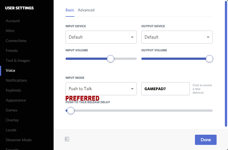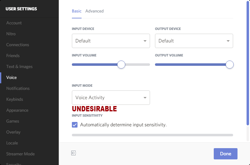 If you look up at the top, you will see that you are on the Basic Voice Settings page. Now click Advanced. See where it says Noise Suppression? I would UNCHECK that unless you’re in a war zone or something. This setting attempts to suppress background noise. What it really does is make your voice sound odd and sometimes unintelligible. Now you can click Done.