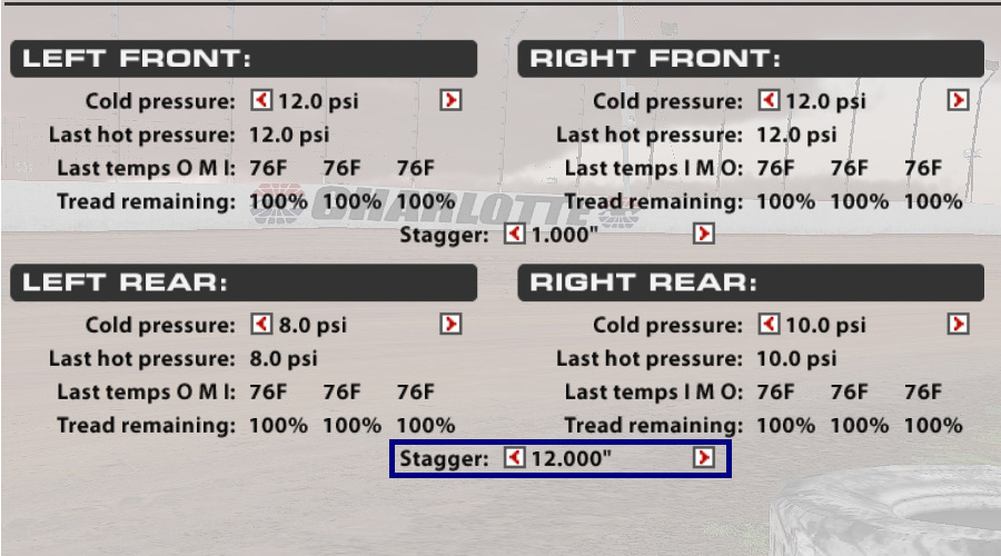 - Adjust your rear tire stagger. Increase your rear stagger by about two inches. In the image below, you would increase the rear stagger from 12 inches to 14 inches. You can try different staggers if you like, just be sure to test the setting thoroughly after you make any adjustment. This will loosen the car in the corners, and loose is fast.