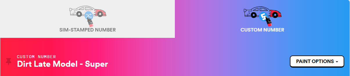 You might recognize this image from the Trading Paints website. Note that there are two tabs — Sim-Stamped Number and Custom Number. Note that you will only see the Custom Number tab if you have upgraded to Trading Paints Pro.