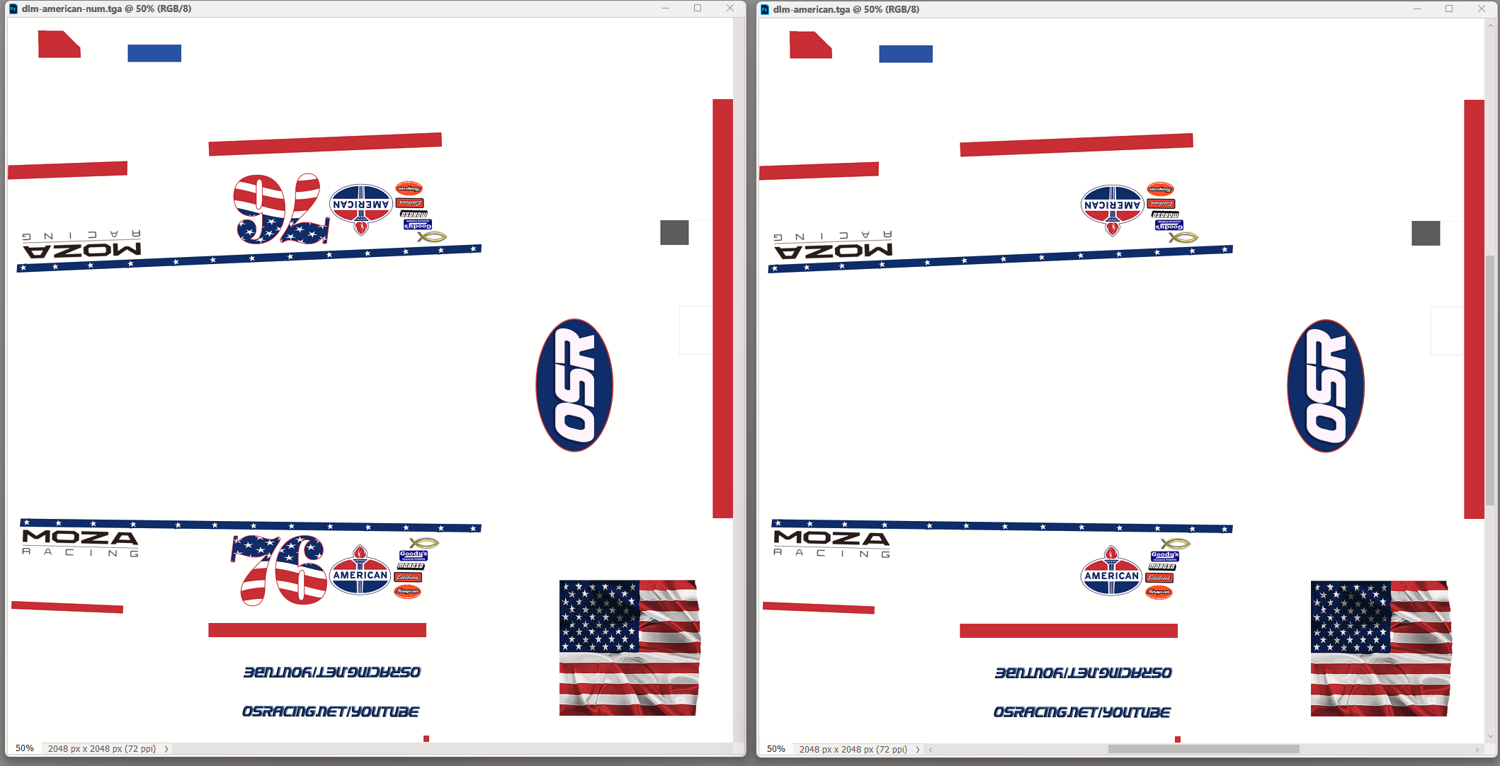 This image contains two paint files (.tga format) that are indentical except for one thing. The one on the left has a “baked-in” car number. The one on the right has no car number. You should always have both of these files when you get ready to upload your custom paint to Trading Paints.
