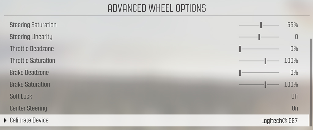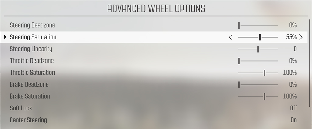 You’re done. I told you it was simple and straightforward. One thing I’ll point out here: In the image above, I have my Steering Saturation at 55%. This is not what Codemasters recommends. With their wheel configuration, they recommend leaving the saturation at 100%. See the image below.