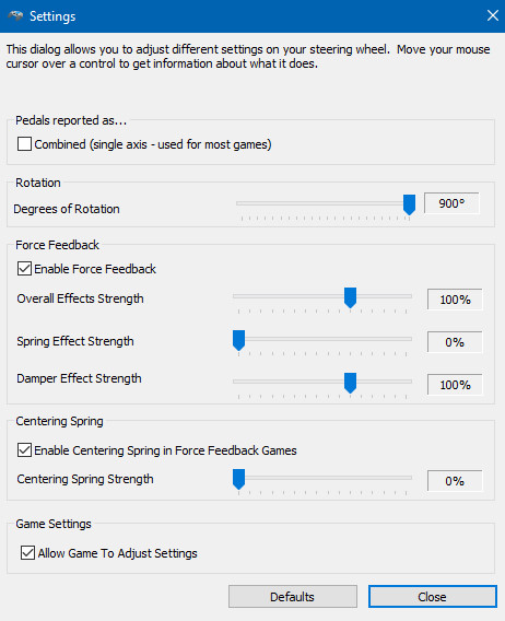 You can experiment with these settings, but I recommend leaving the Spring Effect, Damper Effect, and Centering Spring at 0%. The overall effects strength can be set to 100% to 105%, it’s not a big deal. I sometimes turn the force feedback off entirely and turn up the centering spring to about 35%. This feels very smooth and the centering spring helps bring the wheel back to center if you get turned around.
