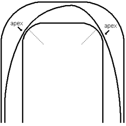 There on the left you see a very simple diagram I made with my Crayolas. The turns are exaggerated (the track actually looks a little bit like Indianapolis Motor Speedway with that short chute, or tiny straightaway between the corners) to better illustrate the concept of diamonding a corner. You can see now why it’s called a double apex. You apex on entry and on exit. When you make one complete lap, your live takes the shape of a diamond (sort of), hence the technique also became known as diamonding the corner. As the diagram shows, you turn in, drift up, turn down, then drift up again.