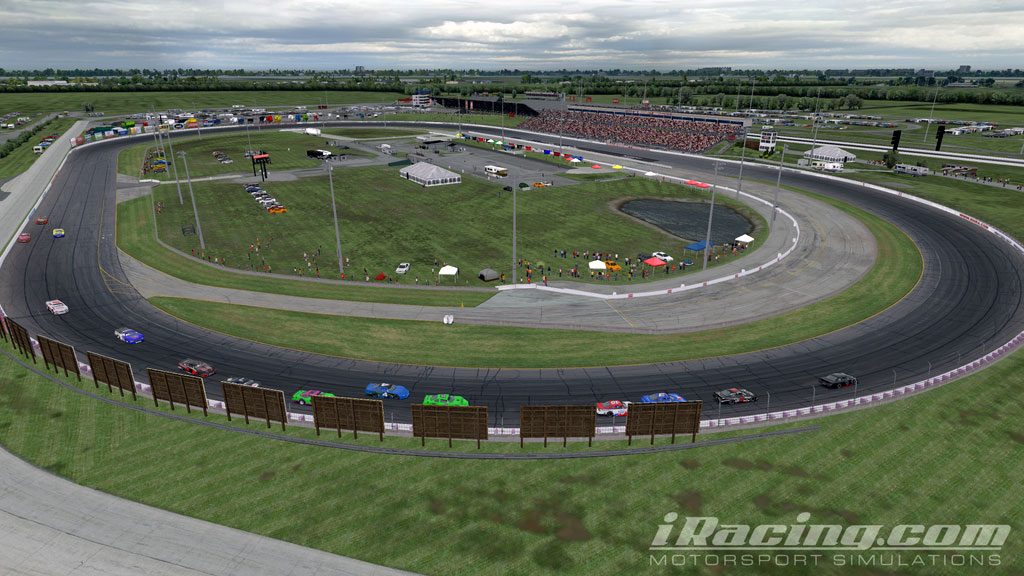 Lucas Oil Raceway is a .686 (just a skosh more than two thirds) mile oval located in Brownsburg, Indiana. It has a traditional symmetrical oval shape. The banking is moderate at 12° although it feels pretty flat when you’re driving on it. The racing surface is three full lanes wide with a low lane that is typically not used for racing and an apron below that. The preferred racing line is generally high, near the wall, but many drivers will use the middle of the track on entry and exit.