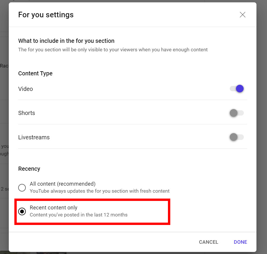 - Modify the content type to feature only the specific content that strongly represents your channel’s focus. For instance, if your primary content revolves around videos rather than shorts or live streams, consider including only videos in your “For You” section. However, select the content type that best suits your channel’s objectives.
