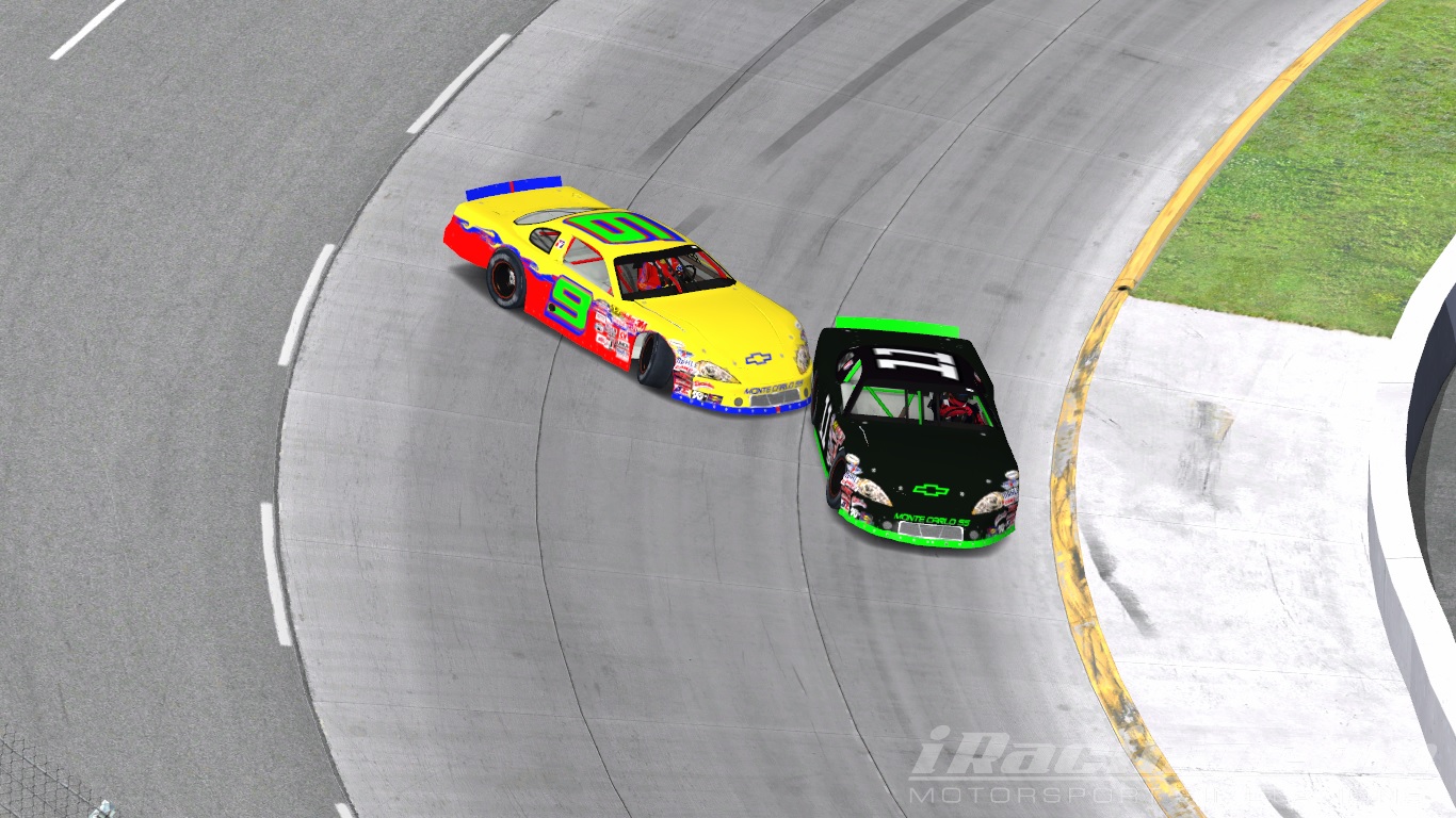 Yet again this week, we have a case of an inexperienced racer, at least one lap down, blocking the leader. I’ll say once again that this should be a rules infraction that is protestable under the sporting code. Lapped cars wouldn’t get away with these shenanigans on any real track that I’m aware of. This time it was Randy Lamberti who had some sort of notion that he should block the leader, despite having no chance of ever winning the race. For all of three laps, Bragg went low, went high, and did everything he could to pass Lamberti, and he was intentionally blocked each and every time.
