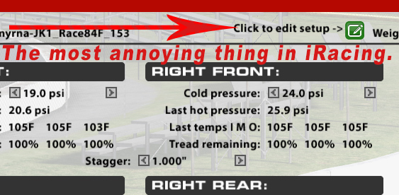 Okay, maybe this isn’t the most annoying thing in iRacing, but it’s pretty darn annoying if you work on iRacing setups a lot. Every time you get out of the car to make a setup change, you’re confronted with grayed out controls. You can’t change anything until you click this annoying little green button on the upper right side. I normally don’t open the garage unless I plan to make a setup change. Why is this button even there?